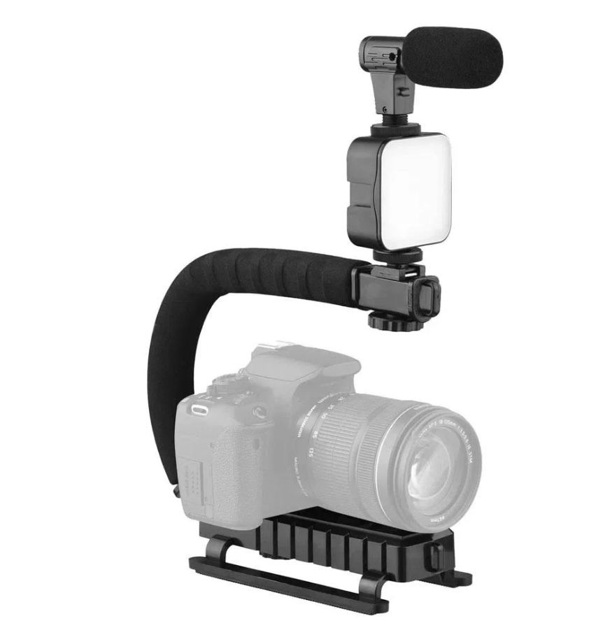- Este kit portátil incluye un soporte de mano con forma de U/C, una mini luz LED, un micrófono, un soporte para teléfono y un control remoto; perfecto para blogs, podcast, transmisiones en vivo, Youtube, clases virtuales y más.